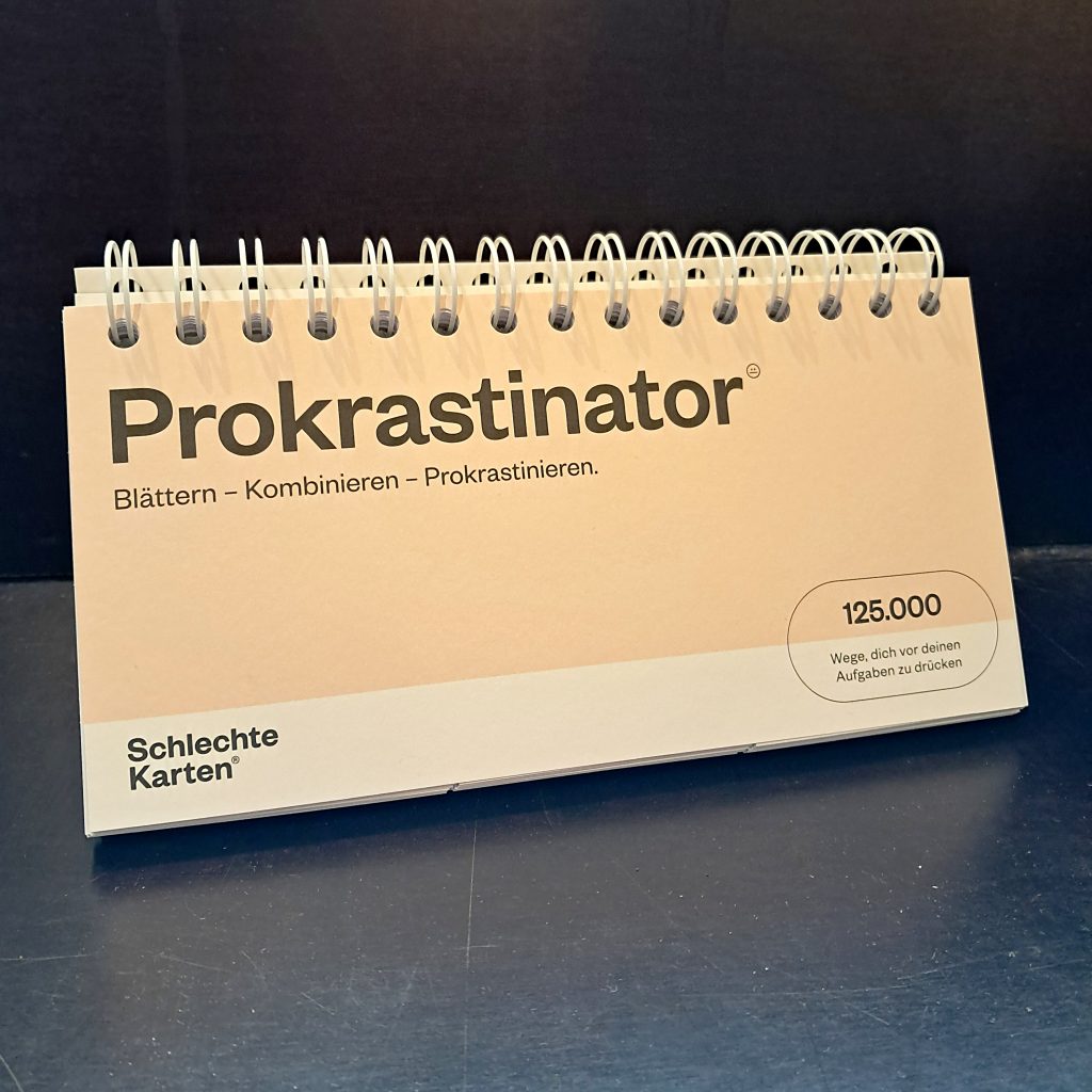 Ihr findet bei uns verschiedene demotivierende Produkte wie Postkarten, Notizbücher, den Prokrastinator uvm.